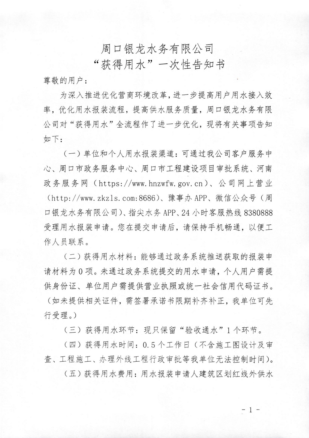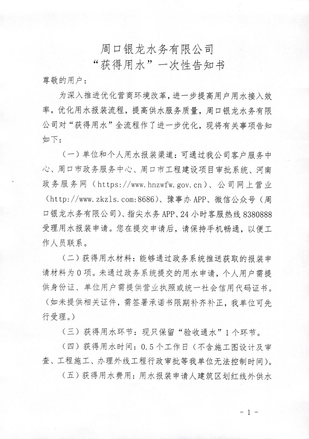 周口银龙水务无限公司“取得用水”一次性奉告书